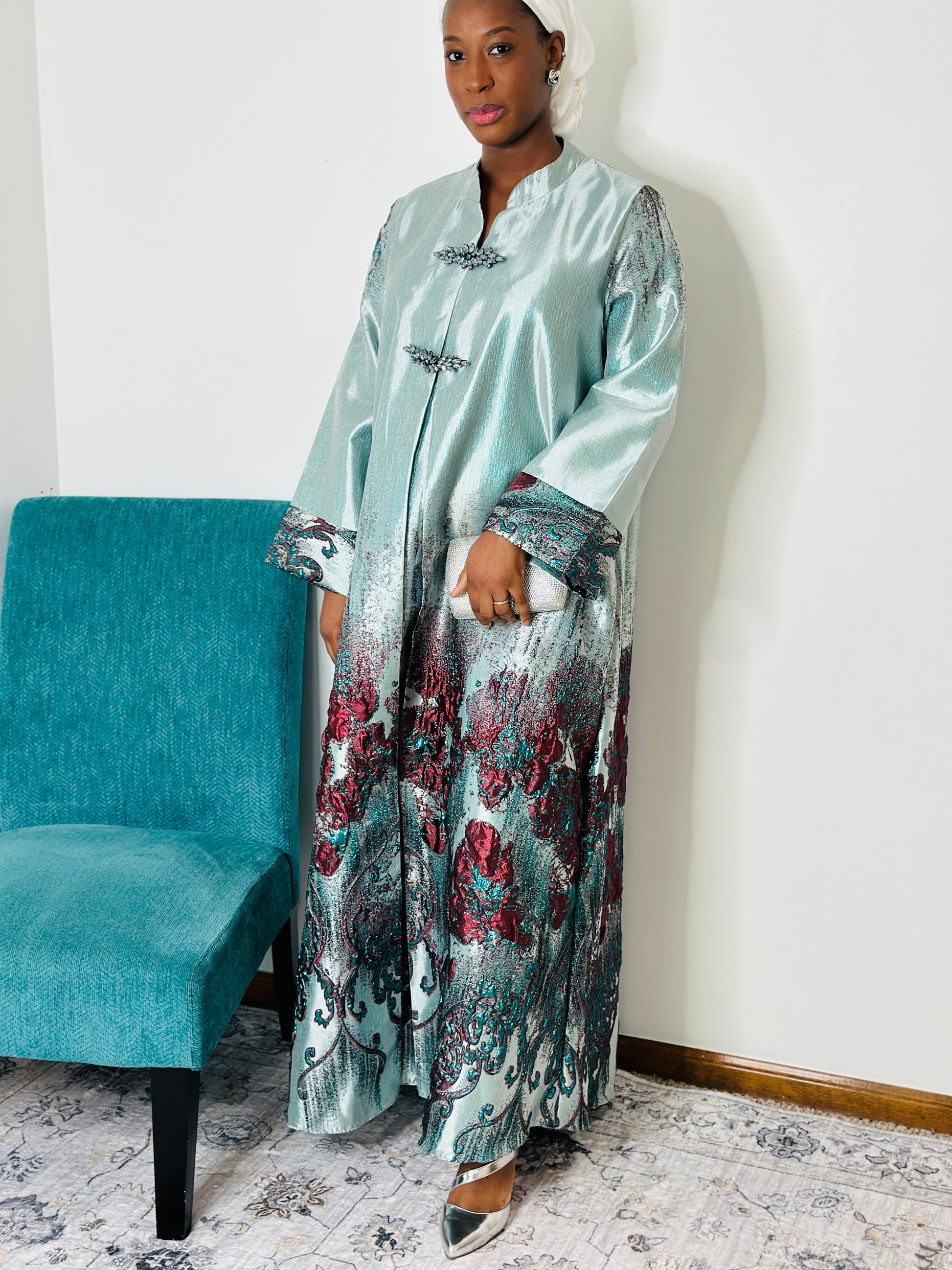 Aïssata Royale is crafted from luminous metallic brocade and adorned with rich floral embroidery. Featuring crystal toggle closures and a regal silhouette, this piece blends cultural elegance with quiet luxury.