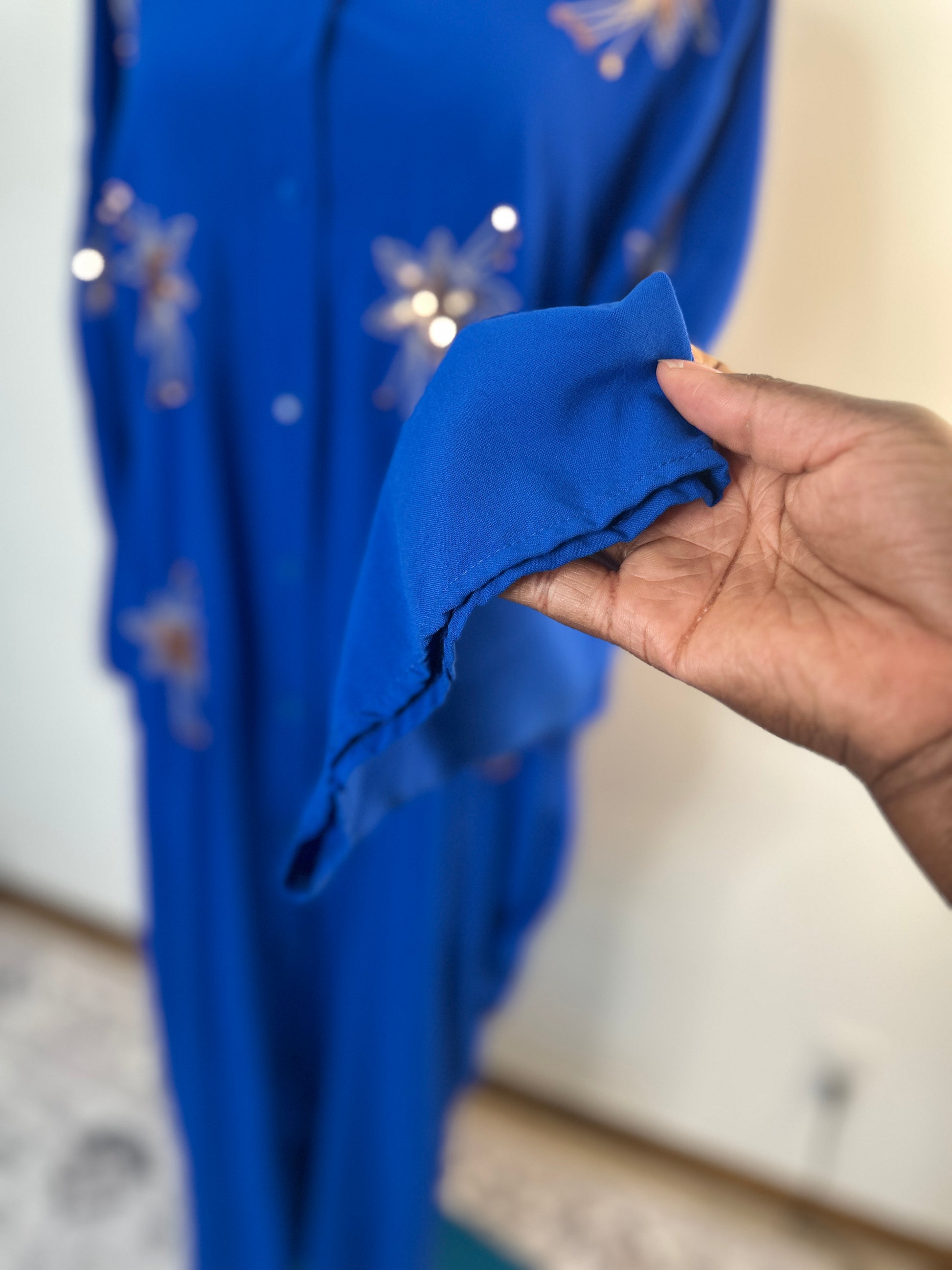 Make a bold yet graceful statement with the Royal Blue Shirt Dress. Crafted in a stunning royal blue with intricate sequin floral embroidery, this piece combines comfort and elegance for everyday modest wear.